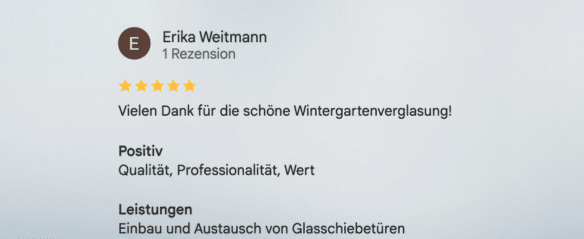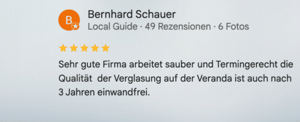 »Sehr gute Firma arbeitet sauber und termingerecht, die Qualität der Verglasung auf der Veranda ist auch nach 3 Jahren einwandfrei.«