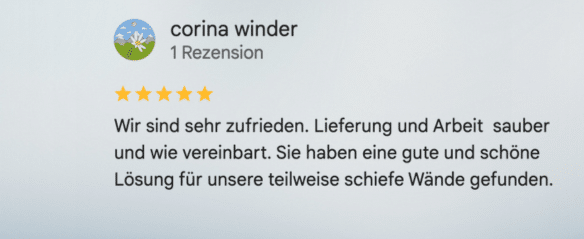 »Wir sind sehr zufrieden. Lieferung und Arbeit sauber und wie vereinbart. Sie haben eine gute und schöne Lösung für unsere teilweise schiefen Wände gefunden.«