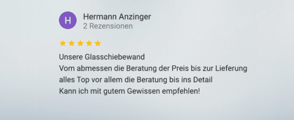 »Unsere Glasschiebewand – Vom Abmessen, die Beratung, der Preis bis zur Lieferung, alles Top. Vor allem die Beratung bis ins Detail kann ich mit gutem Gewissen empfehlen!«