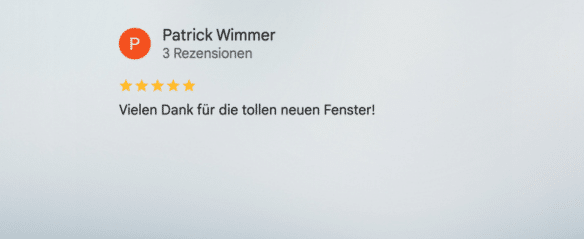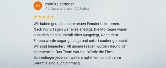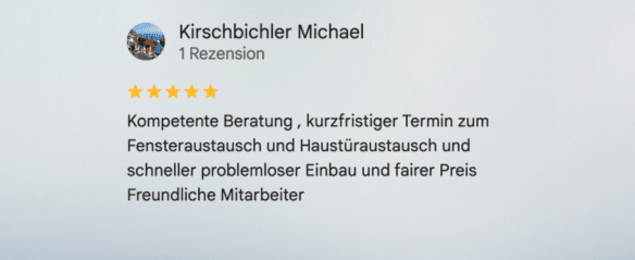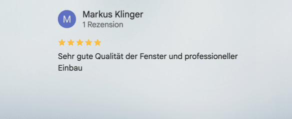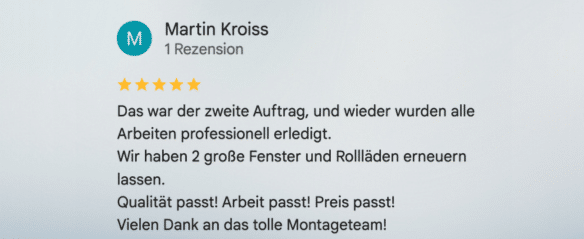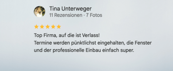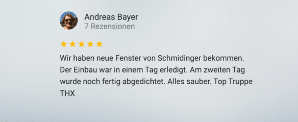 »Top Firma, auf die ist Verlass! Termine werden pünktlichst eingehalten, die Fenster und der professionelle Einbau einfach super.«