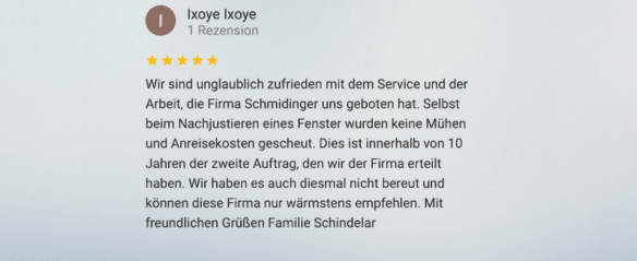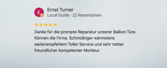 »Danke für die prompte Reparatur unserer Balkon-Türe. Können die Firma Schmidinger wärmstens weiterempfehlen! Toller Service und sehr netter freundlicher, kompetenter Monteur.«