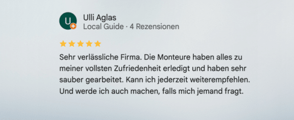 »Sehr verlässliche Firma. Die Monteure haben alles zu meiner vollsten Zufriedenheit erledigt und haben sehr sauber gearbeitet. Kann ich jederzeit weiterempfehlen. Und werde ich auch machen, falls mich jemand fragt.«