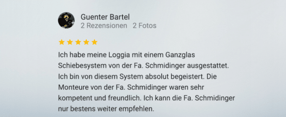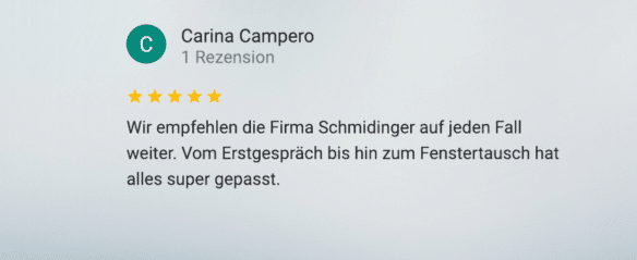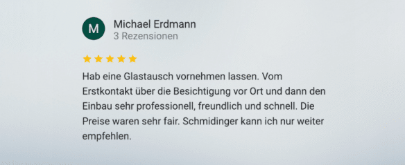 »Hab einen Glastausch vornehmen lassen. Vom Erstkontakt über die Besichtigung vor Ort und dann den Einbau sehr professionell, freundlich und schnell. Die Preise waren sehr fair. Schmidinger kann ich nur weiterempfehlen.«