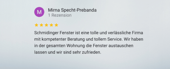 »Schmidinger Fenster ist eine tolle und verlässliche Firma mit kompetenter Beratung und tollem Service. Wir haben in der gesamten Wohnung die Fenster austauschen lassen und wir sind sehr zufrieden.«