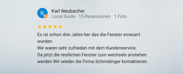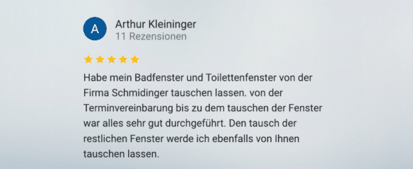 »Habe mein Badfenster und Toilettenfenster von der Firma Schmidinger tauschen lassen. Von der Terminvereinbarung bis zu dem Tauschen der Fenster war alles sehr gut durchgeführt. Den Tausch der restlichen Fenster werde ich ebenfalls von ihnen tauschen lassen.«