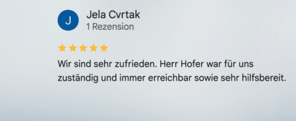 »Wir sind sehr zufrieden. Herr Hofer war für uns zuständig und immer erreichbar sowie sehr hilfsbereit.«