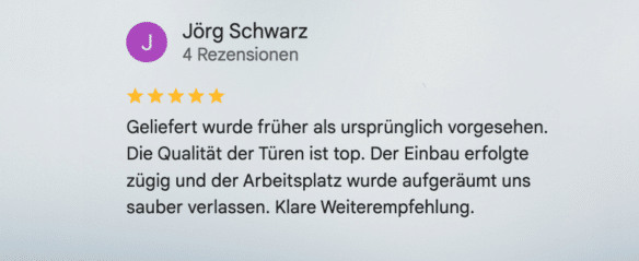 »Geliefert wurde früher als ursprünglich vorgesehen. Die Qualität der Türen ist top. Der Einbau erfolgte zügig und der Arbeitsplatz wurde aufgeräumt und sauber verlassen. Klare Weiterempfehlung.«