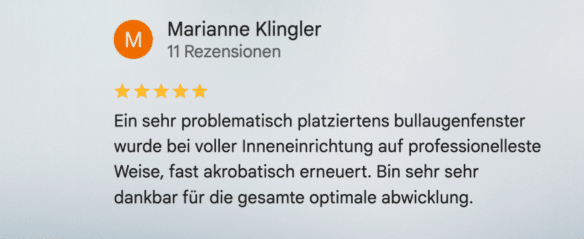 »Ein sehr problematisch platziertes Bullaugenfenster wurde bei voller Inneneinrichtung auf professionellste Weise, fast akrobatisch, erneuert. Bin sehr, sehr dankbar für die gesamte optimale Abwicklung.«
