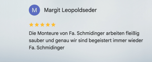 »Die Monteure von Fa. Schmidinger arbeiten fleißig, sauber und genau. Wir sind begeistert – immer wieder Fa. Schmidinger.«